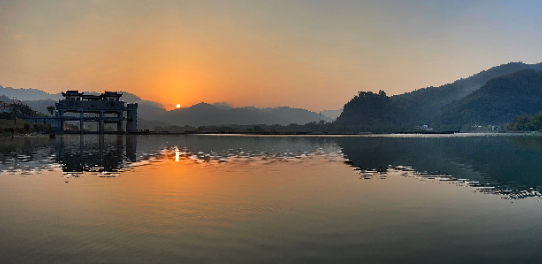 清晨,晨光未露之时,游走于寨寮湖岸,有些早起的水鸟发出很动听的鸣声,偶有鱼儿跃出水面。令人惊喜的是,日出的位置,正位于滩脚堰坝对面山峦的正中。于是,一轮红日缓缓升起,将整个湖面都照得通红一片,不费一点脚力便欣赏到了。