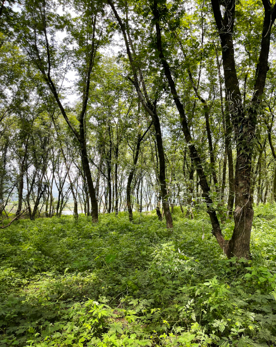 寨寮青空的对岸,滩林新绿,衬托着烟波浩渺,一片静谧。这些滩林深处,春日踏青或者露营,也极为合适。